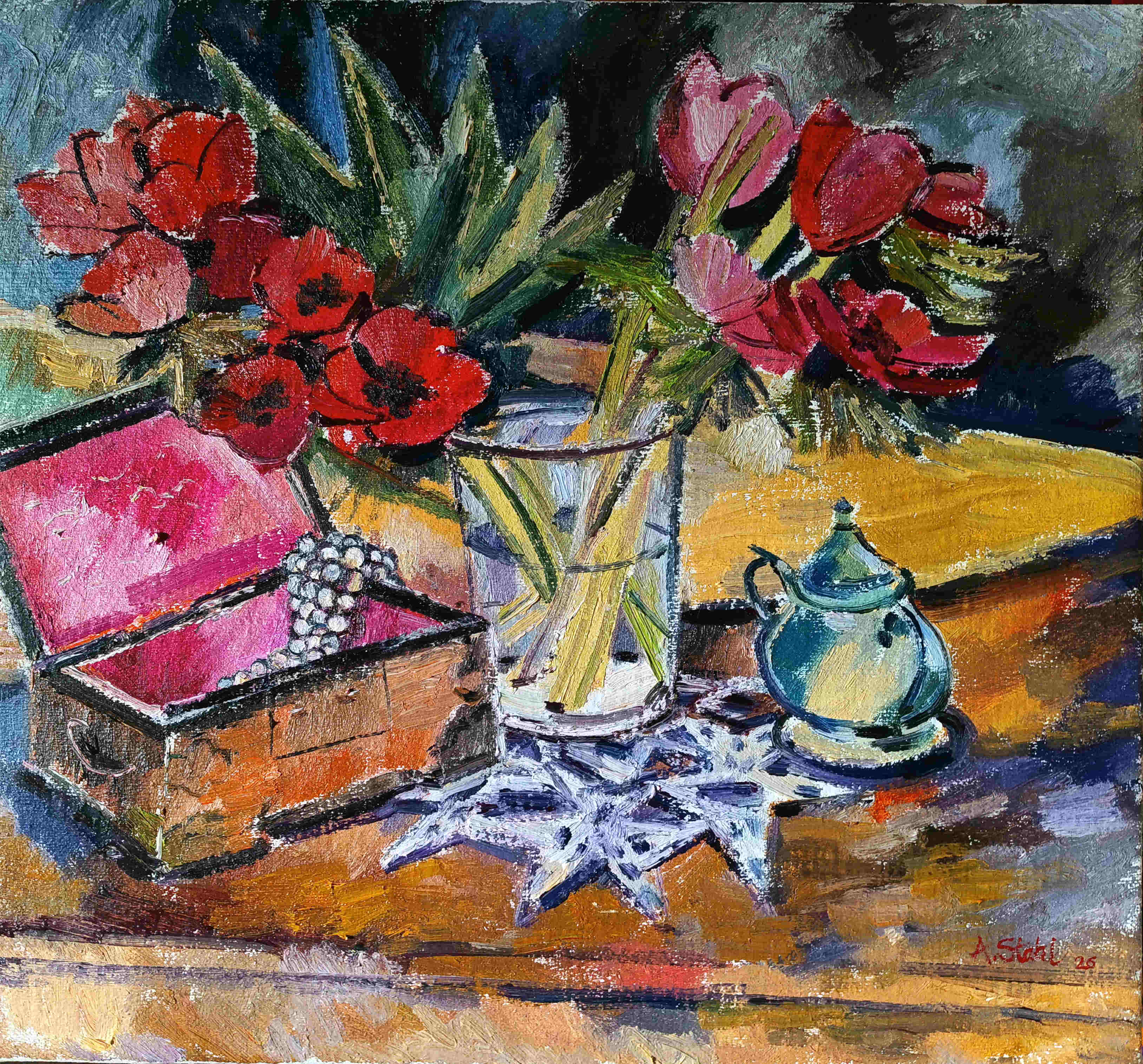 Anemonen Tulpen-s Verfasst von arnestahl am Februar 20, 2026Februar 20, 2026 Öl auf Leinwand, 60x55cm, 2026